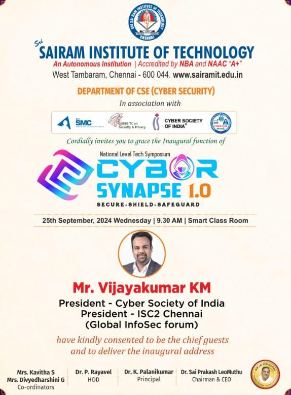 Chief Guest in National level Tech Symposium – CYBER SYNAPSE 1.0 organised by SAIRAM Institute of Technology