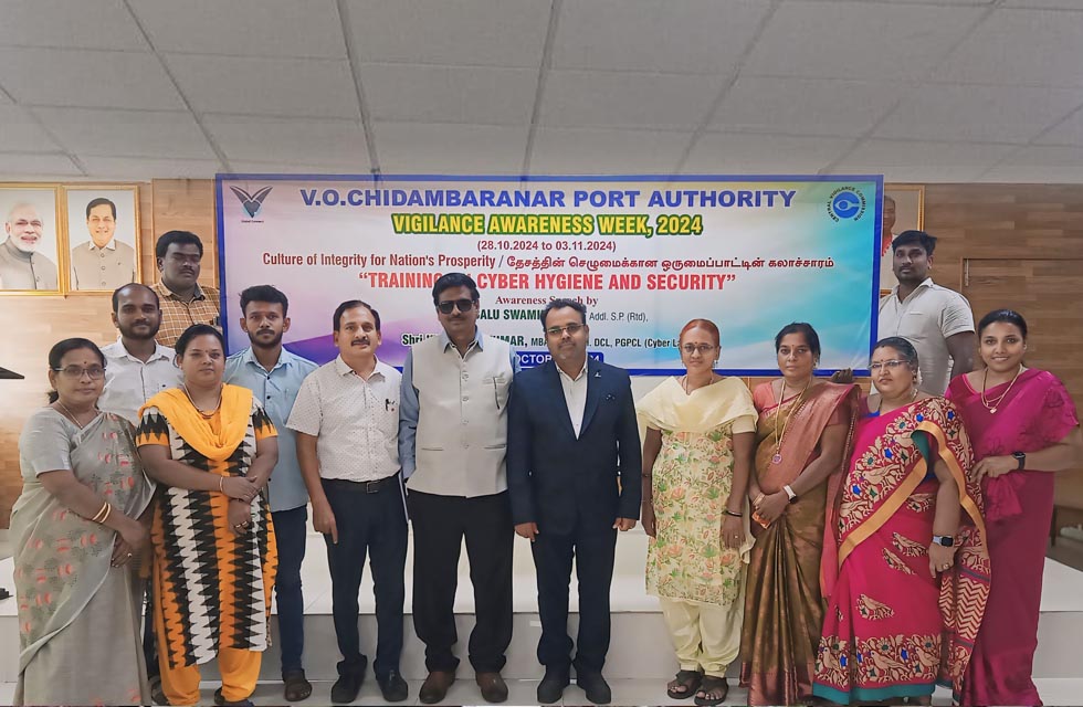As part of Vigilance Awareness Week 2024, the Port conducted an awareness session on “Cyber Hygiene & Security” for its employees, CISF personnel, and key stakeholders. The session featured insightful presentations by Mr. K.M. Vijayakumar, President of CySI, and Mr. Balu Swaminathan, Secretary of CySI, who shared essential guidance on protecting against cyber threats.